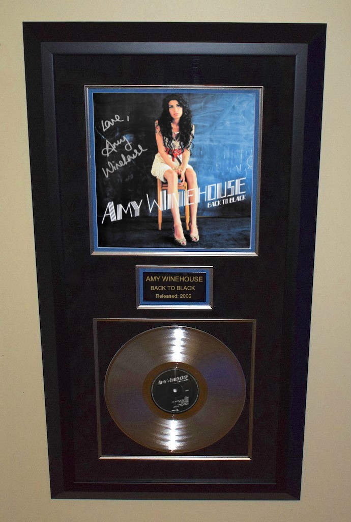 Custom Designed Vertical Award Style with black Beveled Solid Hard Wood Frame, Black & Blue Suede, Silver Fillets, Gloss Black / Silver Letters Amy Winehouse Logo Custom Name Plaque & Genuine RIAA Platinum Award Album.