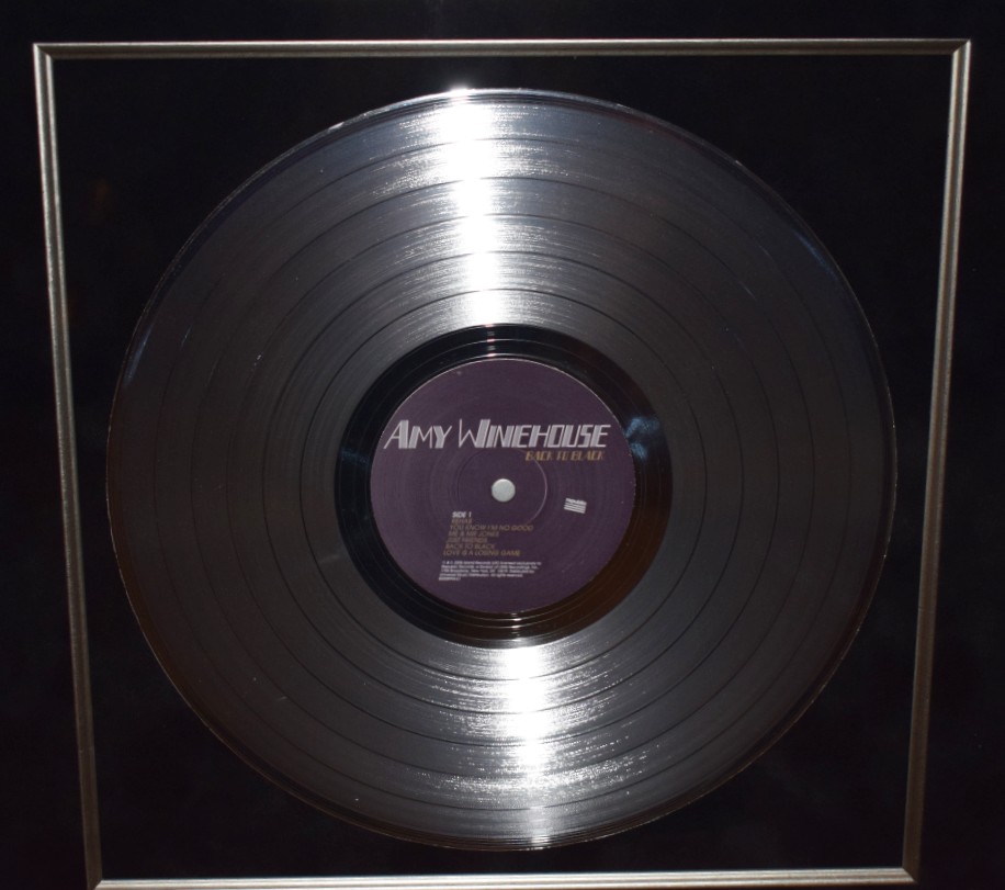 Custom Designed Vertical Award Style with Black Beveled Solid Hard Wood Frame, Black & Tan Suede, Silver Fillets, Amy Winehouse Custom Logo Name Plaque and Genuine RIAA Platinum Award Album.