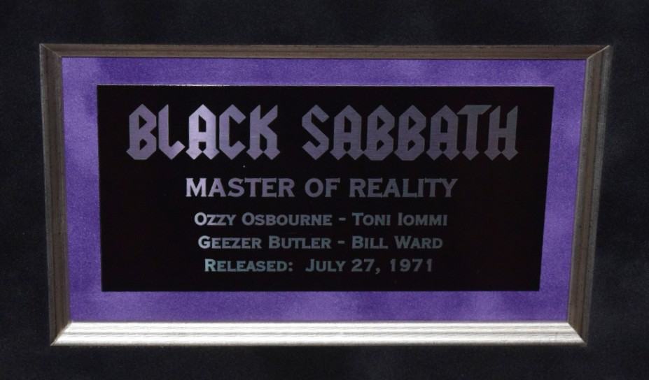 Custom Designed Vertical Award Style with Black Solid Hard Wood Frame, Black & Purple Suede, Silver Fillets, Gloss Black / Silver Letters Sabbath Logo Custom Name Plaque and Genuine RIAA Platinum Award Album.