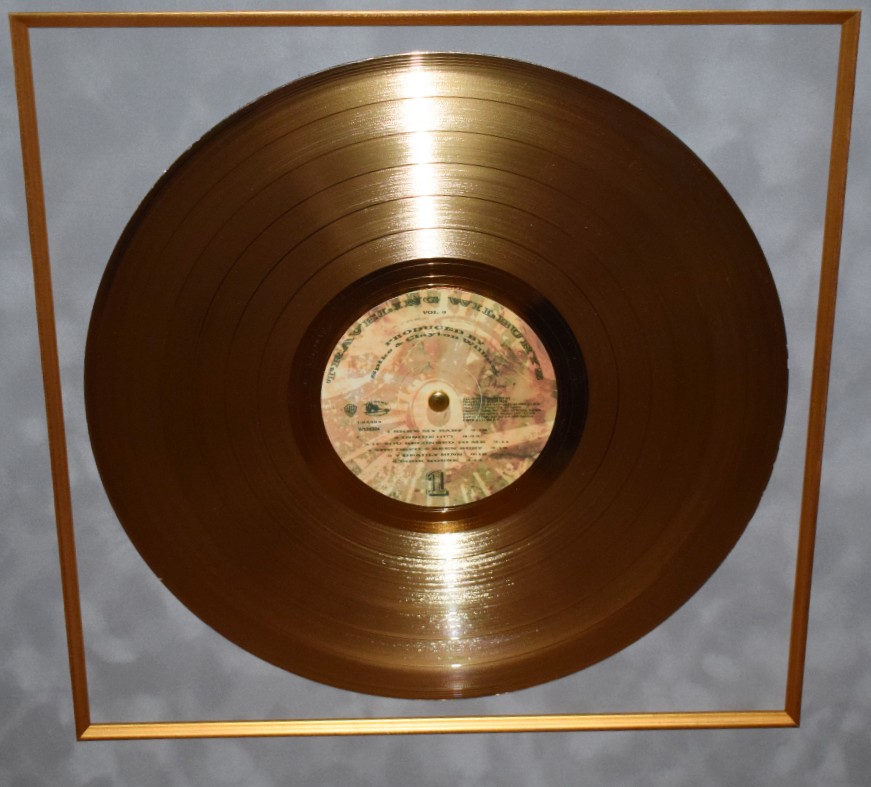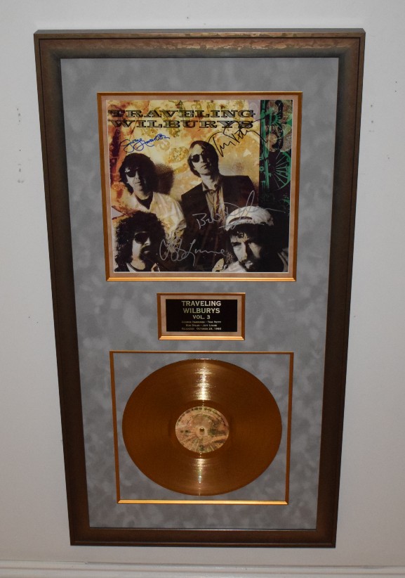 Custom Designed Spectacular Vertical Award Style with Imported Two Tone Brown / Bronze Block Solid Hard Wood Frame, Grey & Red Suede, Gold Fillets, black Wilburys Custom Logo Name Plaque with Gold Letters and Genuine RIAA Gold Award Album.