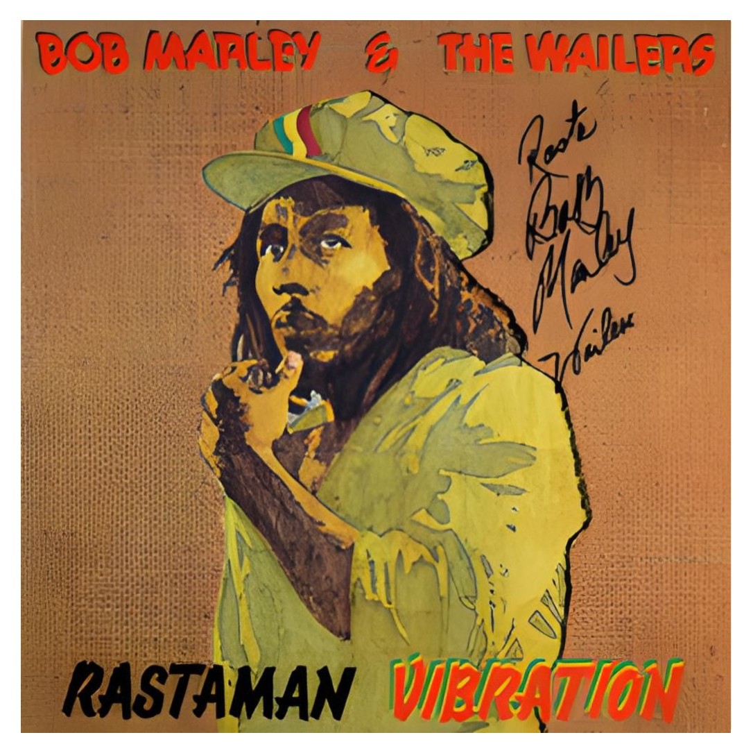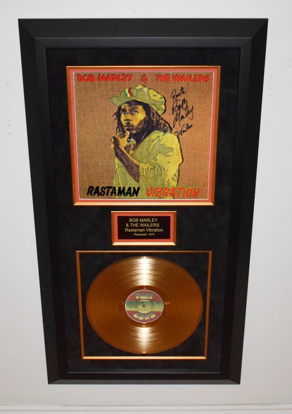 Custom Designed Vertical Award Style with Black Beveled Solid Hard Wood Frame, Black & Red Suede, Gold Fillets, Gloss Black / Gold Letters Bob Marley Signature Custom Name Plaque & Genuine RIAA Gold Award Album.