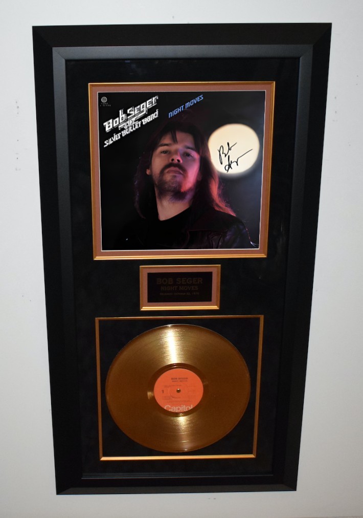 Custom Designed Vertical Award Style with Black Beveled Hard Wood Frame, Black & Brown Suede, Gold Fillets, Gloss Black / Gold Letters Bob Seger Custom Name Plaque and Genuine RIAA Gold Award Album.