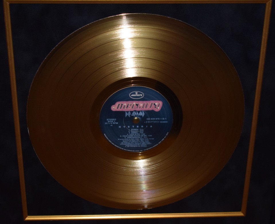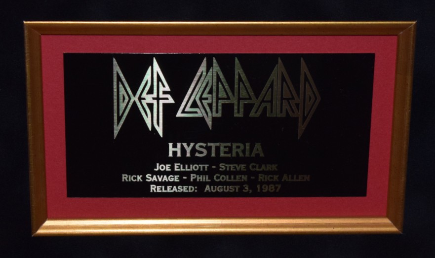 Custom Designed Vertical Award Style with Black Beveled Hard Wood Frame, Black & Red Suede, Gold Fillets, Gloss Black / Gold Letters Def Leppard Logo Custom Name Plaque and Genuine RIAA Gold Award Album.
