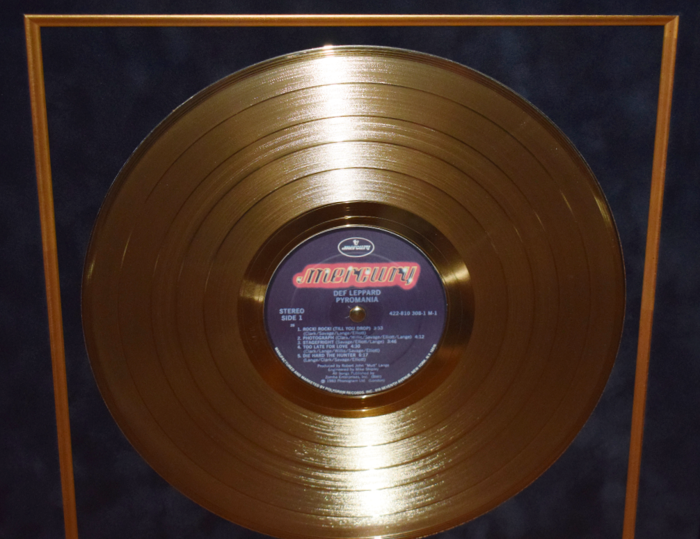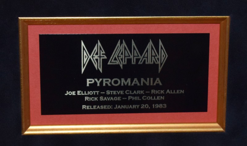 Custom Designed Vertical Award Style with Black Beveled Solid Hard Wood Frame, Black & Red Suede, Gold Fillets, Gloss black / Gold Letters Def Leppard Logo Custom Name Plaque and Genuine RIAA Gold Award Album.