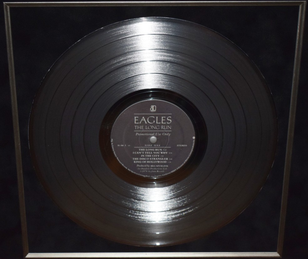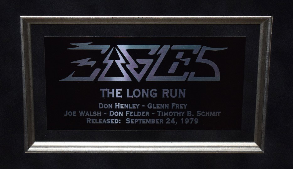 Custom Designed Vertical Award Style with Black Beveled Solid Hard Wood Frame, Black Suede, Silver Fillets, Gloss Black / Silver Letters Eagles Logo Custom Name Plaque & Genuine RIAA Platinum Award Album.