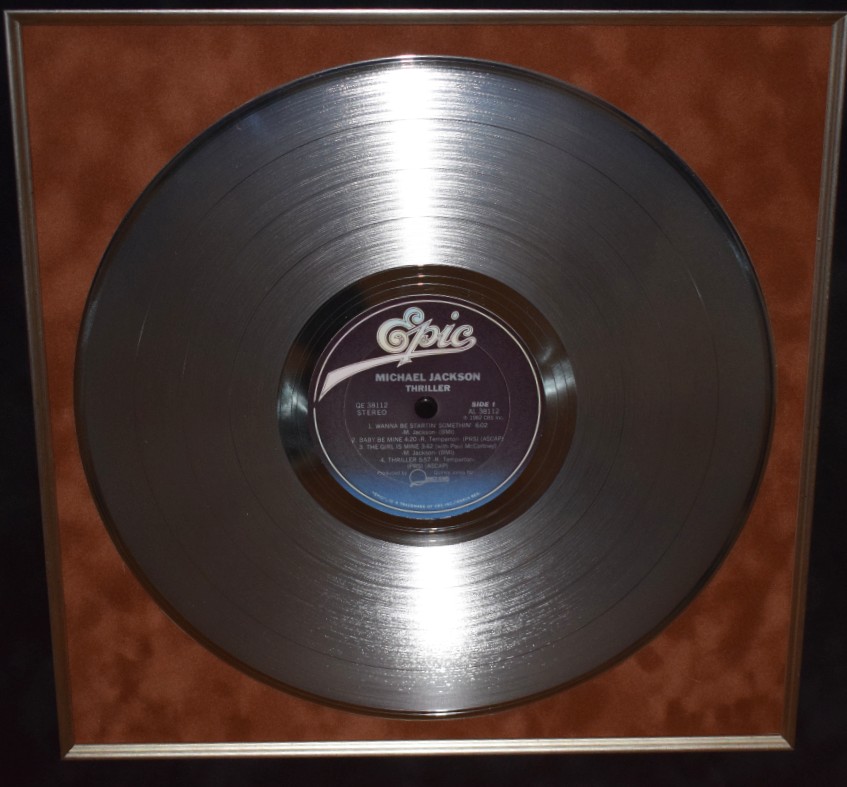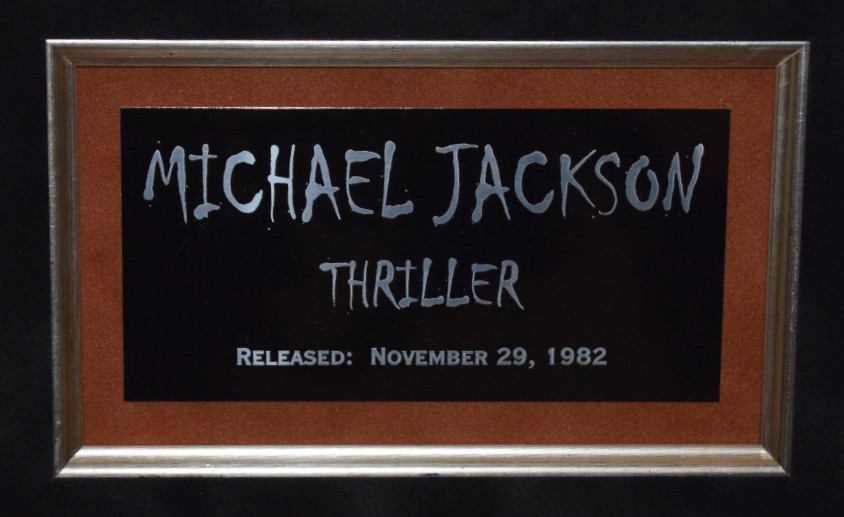Custom Designed Vertical Award Style with Black Beveled Hard Wood Frame, Black & Brown Suede, Silver Fillets, Gloss Black / Silver Letters MJ Signature Custom Name Plaque and Genuine RIAA Platinum Award Album.