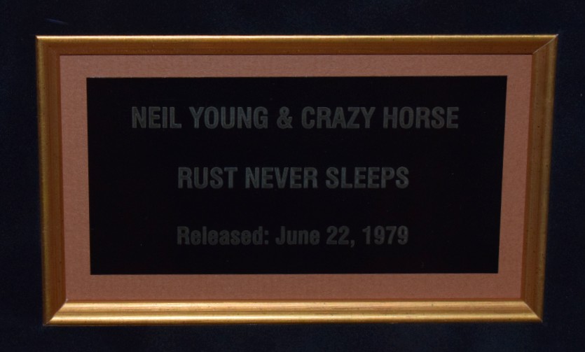 Custom Designed Vertical Award Style with Black Beveled Solid Hard Wood Frame, Black & Brown Suede, Gold Fillets, Gloss Black / Gold Letters Neil Young Custom Name Plaque and Genuine RIAA Gold Award Album.
