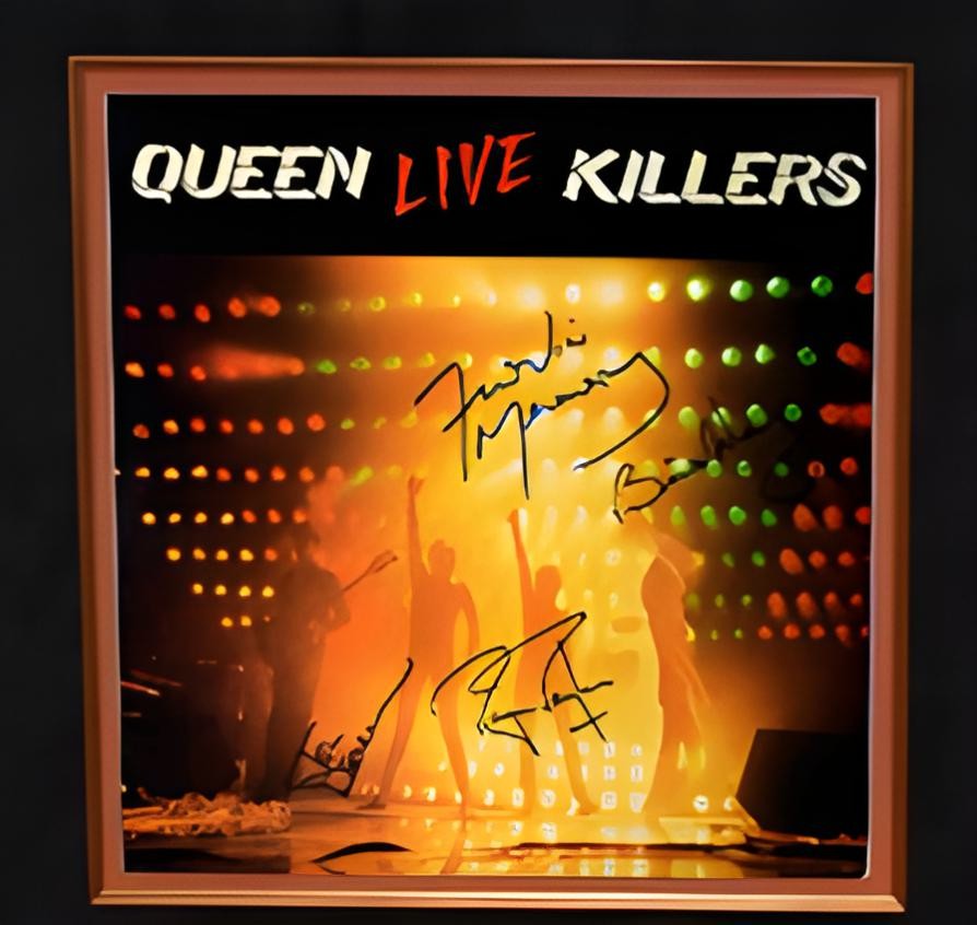Hand signed by: Freddie Mercury, Brian May, Roger Taylor and John Deacon.