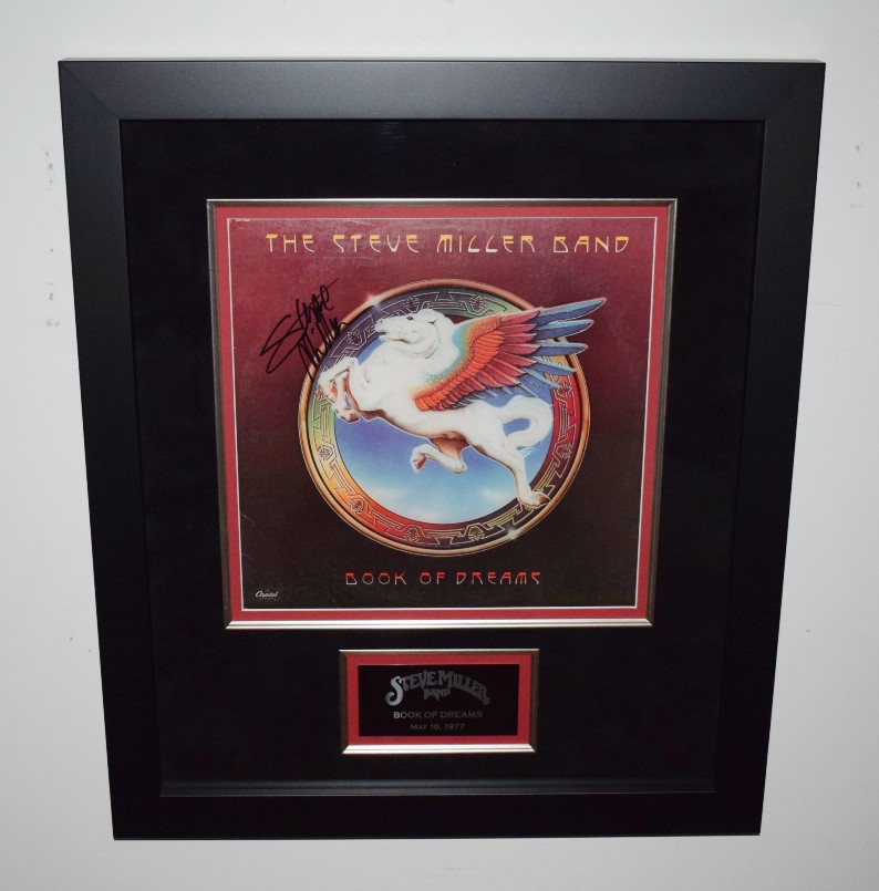 Custom Designed Original Released Album Cover with Solid Black Hard Wood Frame, Black & Red Suede, Silver Fillets , Gloss Black / Silver Letters Steve Miller Band Logo Custom Name Plaque.