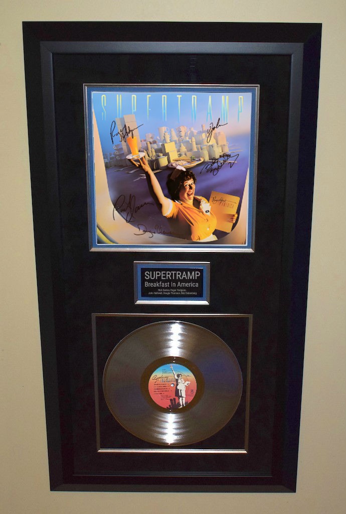 Custom Designed Vertical Award Style with Black Beveled Hard Wood Frame, Black Blue Suede, Silver Fillets, Gloss Black / Silver Letters Supertramp Custom Name Plaque and Genuine RIAA Platinum Award Album.
