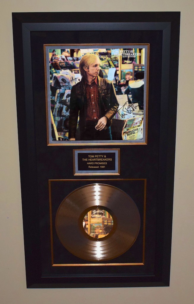 Custom Designed Vertical Award Style with Black Beveled Solid Hard Wood Frame, Black & Blue Suede, Gold Fillets, Gloss black / Gold Letters Tom Petty Logo Custom Name Plaque and Genuine RIAA Gold Award Album.